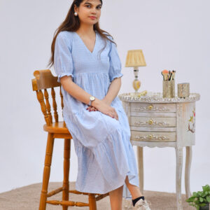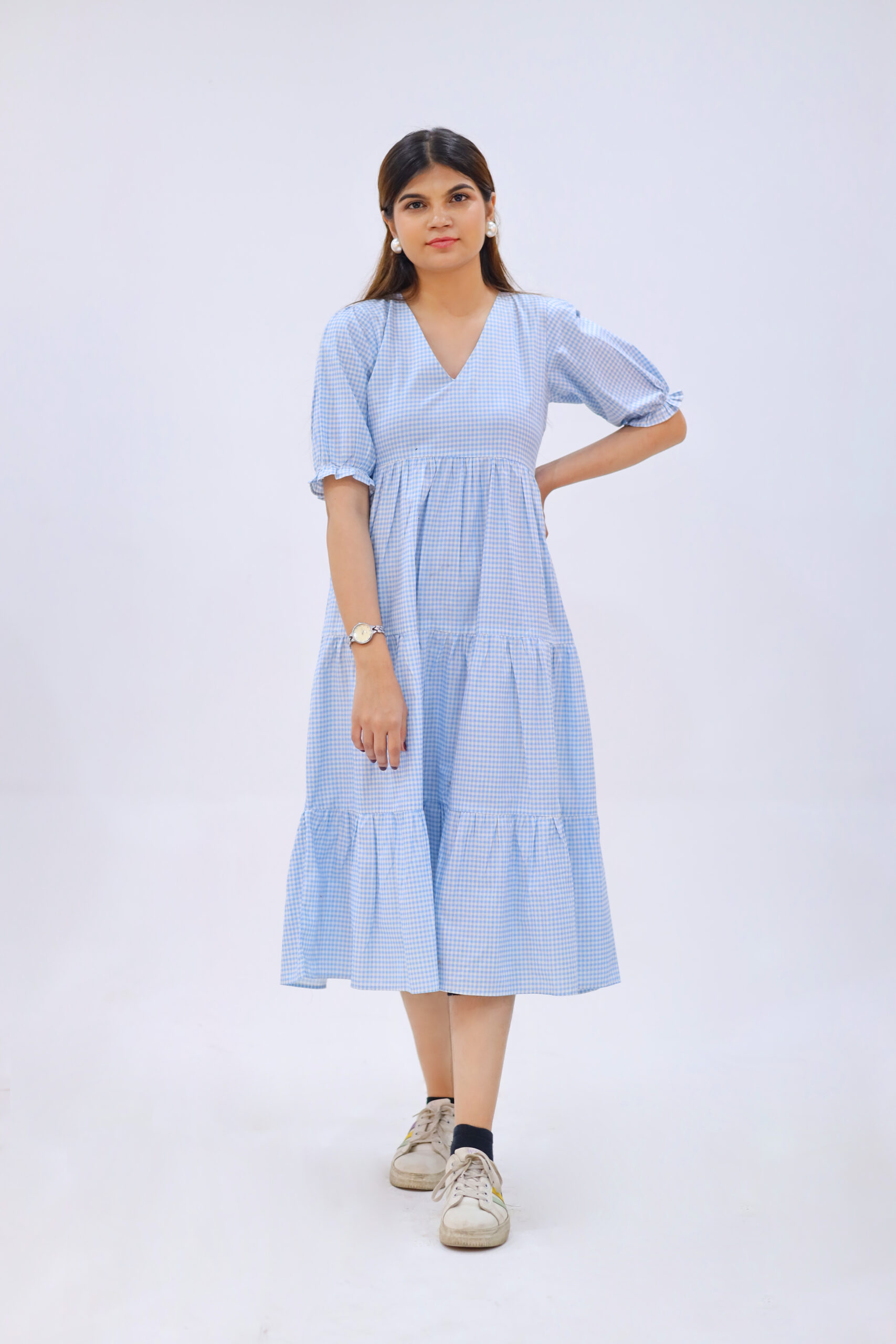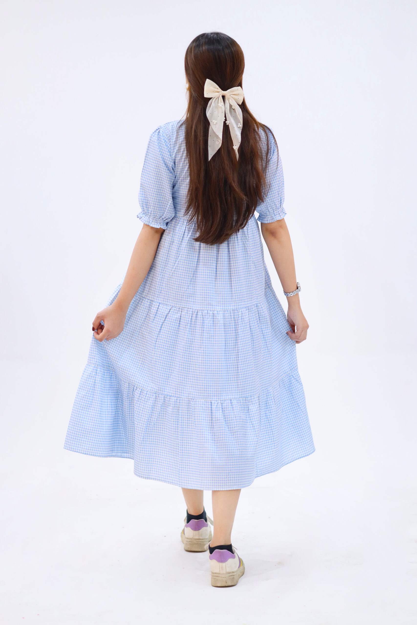 Step into effortless style with the Checkmate Dress, a piece that perfectly captures the spirit of carefree sunny days. This dress is meticulously crafted from a premium cotton blend, providing the crispness of cotton with a touch of flexibility for all-day wear. The iconic light blue gingham pattern offers a nostalgic yet modern aesthetic that feels fresh every time you wear it.