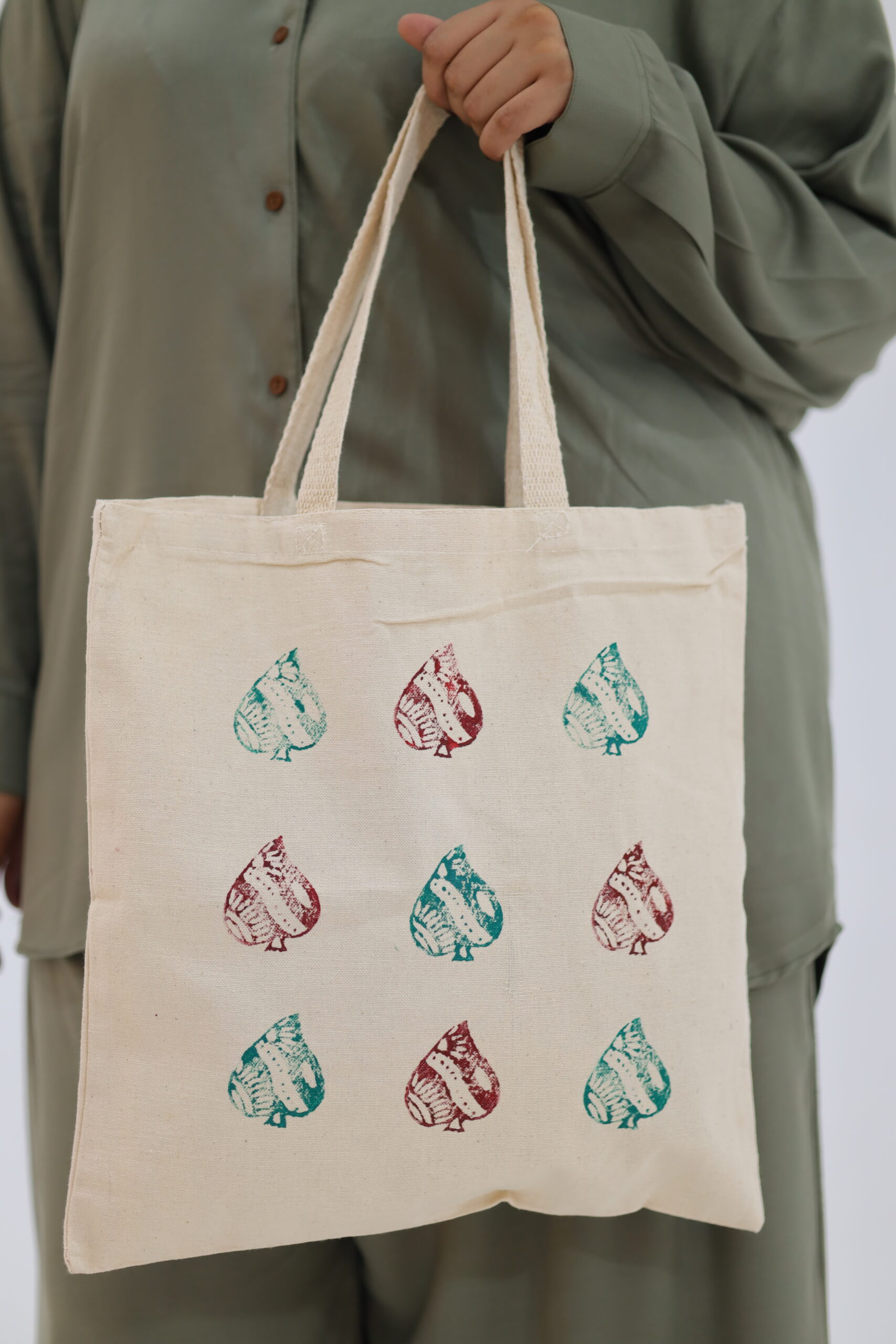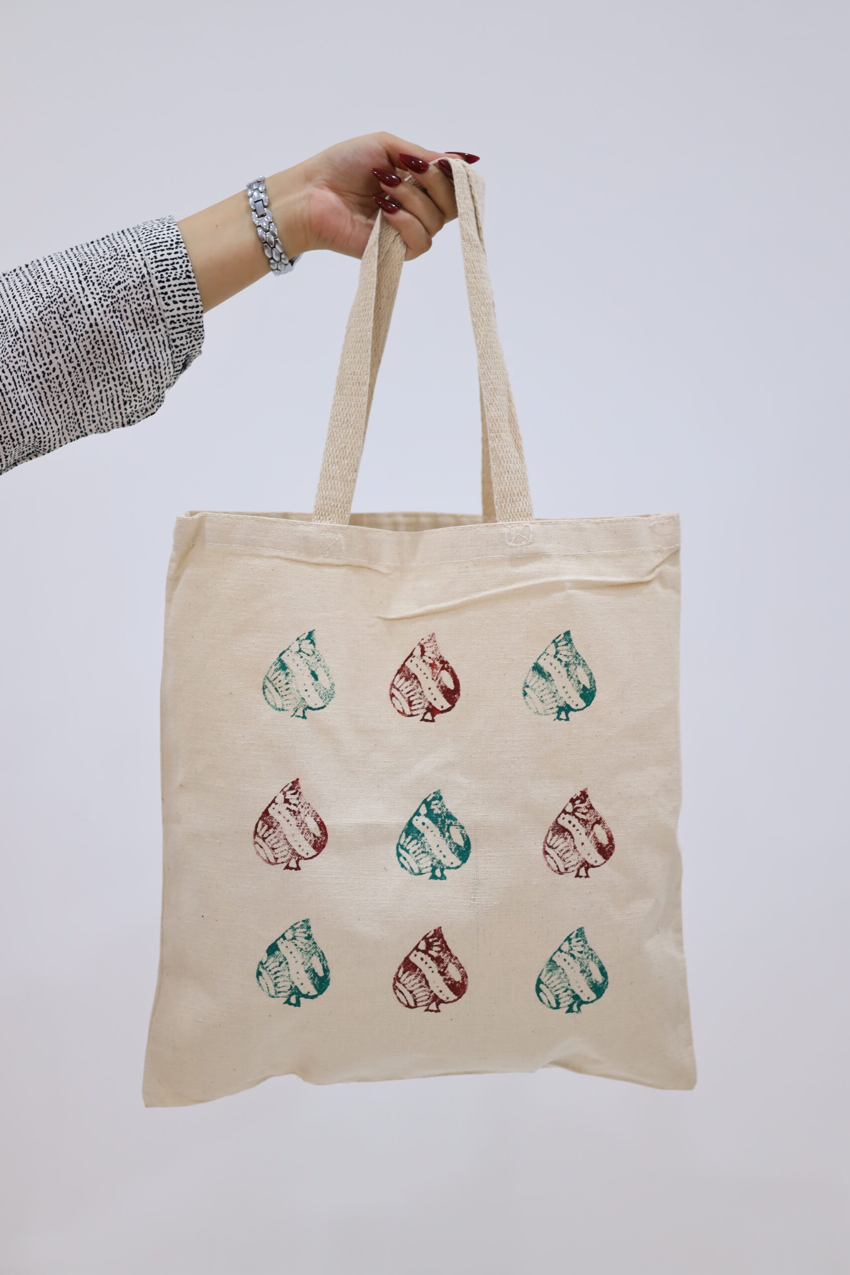 Brighten up your accessory game with the Solitaire Tote, a bag that celebrates repetitive patterns and rich, natural tones. Handcrafted for the expressive minimalist, this tote features a structured grid of hand-painted motifs that resemble stylized leaves or teardrops, each filled with intricate, textured details.