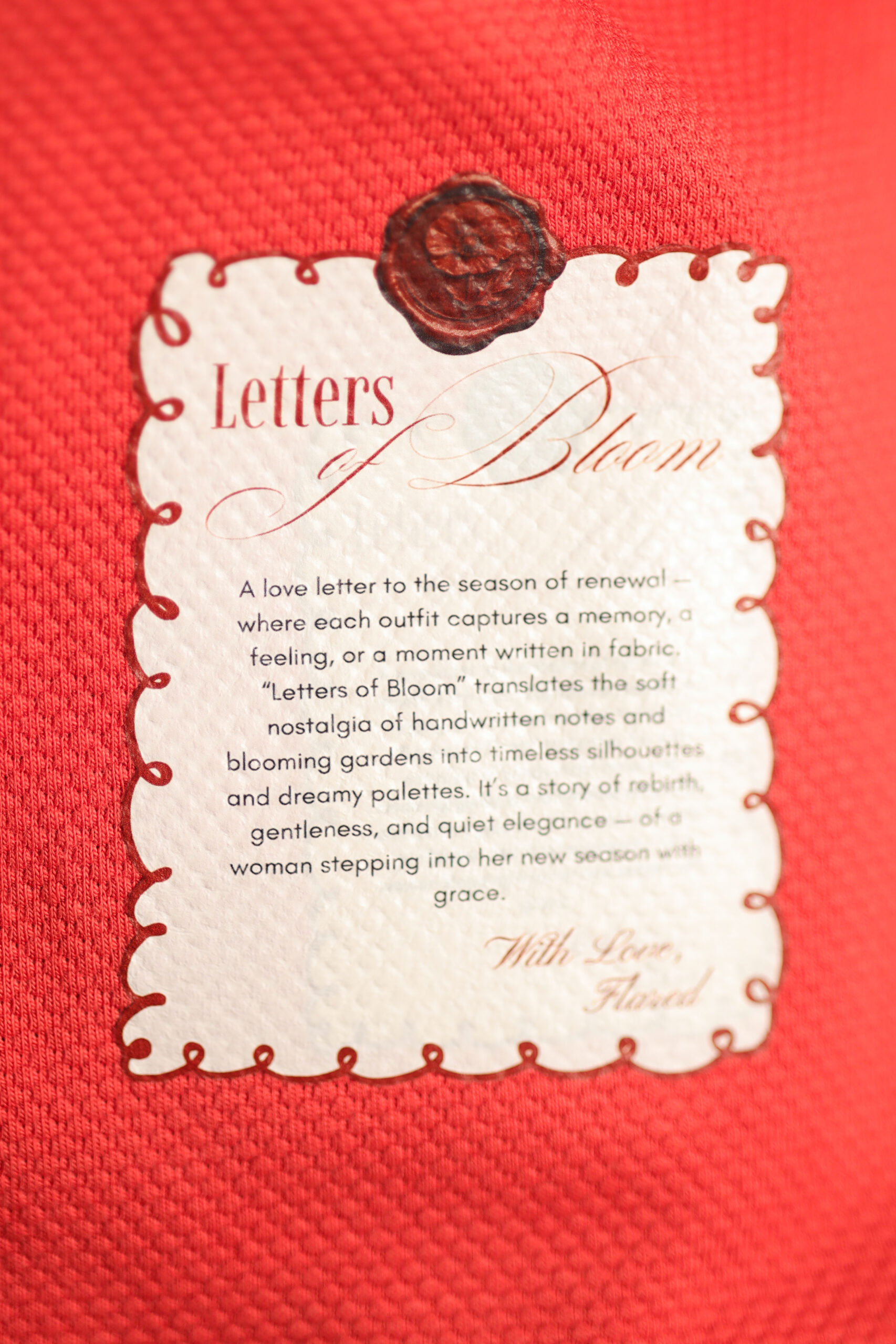 Design: Vibrant red hue with a signature “Letters of Bloom” manifesto patch